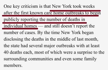 到4月中旬纽约州开始公布死亡人数时,该州的养老院已经发生了数次重大疫情,每次至少有40人死亡。由于此前对疫情情况一无所知,大多数家属和周围的社区居民都对疫情的暴发感到意外。