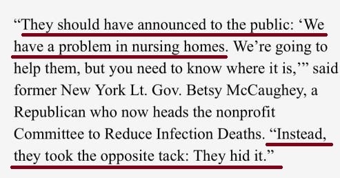 前纽约州副州长、共和党人贝齐麦考西(Betsy McCaughey)说,“他们应该向公众宣布养老院发生了疫情,并提醒公众需要知道疫情出现在哪里。然而他们采取了相反的策略:把疫情隐瞒了起来。”