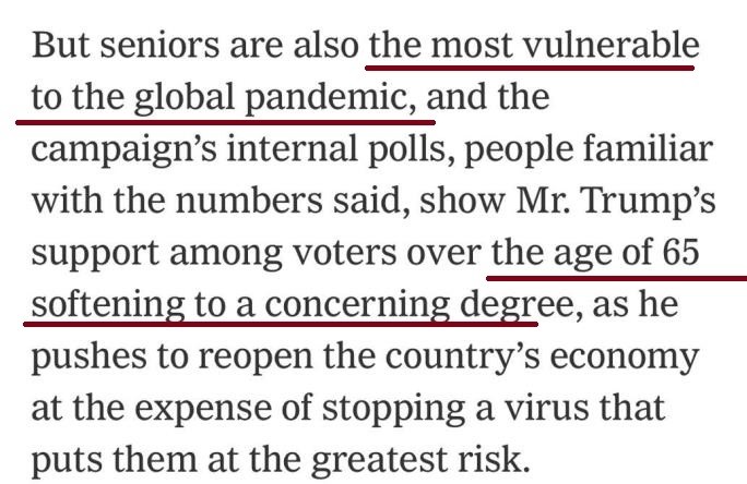 民调机构Morning Consult最近的一项调查显示,老年人对特朗普处理新冠肺炎疫情的做法支持率很低。《纽约时报》报道认为,疫情在养老机构的蔓延,可能导致特朗普失去老年人的支持。在最近的民调中,民主党总统候选人提名者拜登(Joseph R. Biden Jr.)在65岁及以上的选民中比特朗普领先10个百分点。