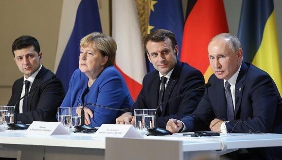 今年12月9日,为解决乌克兰问题的“诺曼底模式”四国峰会9日在巴黎举行,俄罗斯总统普京、法国总统马克龙、德国总理默克尔、乌克兰总统泽连斯基四国领导人出席会议,为乌克兰东部冲突商讨解决办法。四位领导人支持2019年年底前在顿巴斯实现全面停火。