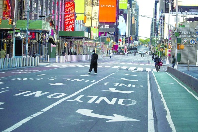 5月9日,在美国纽约时报广场,戴口罩的行人走过空旷的道路。 /新华社