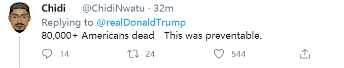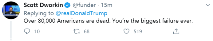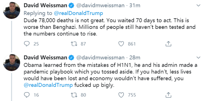 “哥们,78000死亡病例可并不棒。你们等了70天才做出行动。这比班加西(在利比亚)做的还遭。上百万的人目前仍然得不到检测,并且这个数字还在继续上升。”