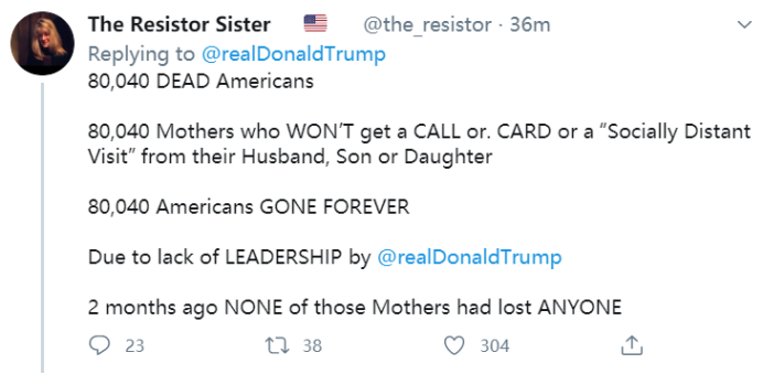此外,由于10日是母亲节,还有网友表示,“80040美国人死了。80040个母亲现在没法收到她们的丈夫、儿子或女儿的一通电话、一张卡片,甚至一次‘符合社交距离的拜访’。80040个美国人永远地走了。都是因为特朗普缺乏领导能力。而2个月前,这些母亲们没有失去任何一位亲人。”