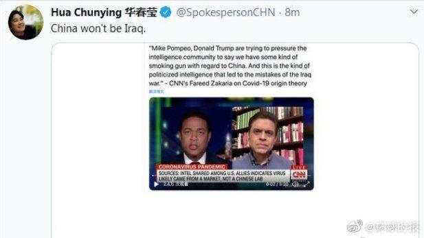 5月9日,外交部发言人华春莹在推特上发了简短有力的一句话:“中国不会成为伊拉克”(China won't be Iraq)。