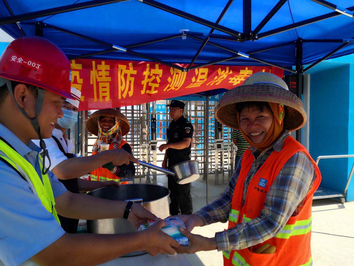 工地上,工程车辆来回穿梭忙碌,自项目复工后,每天有350多名工人同时施工作业。上午11点,工人们陆续下班,中建一局儋州体育中心项目部专门准备解暑药品、绿豆水以及毛巾等生活用品,发放给每一个施工人员。