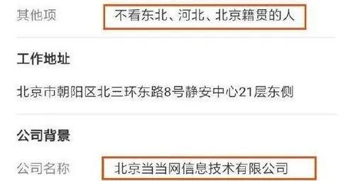 日前,一份当当网的“高级运营经理”招聘要求在网络引发议论。该职位要求“年龄超过35岁不考虑”、“不看东北、河北、北京籍贯的人”,不少网友表示上述要求不合理,“李国庆本人就是北京人,当当为什么不招聘北京籍贯的人?”“要求有6年相关经验,年龄卡在35岁也太死了吧?”