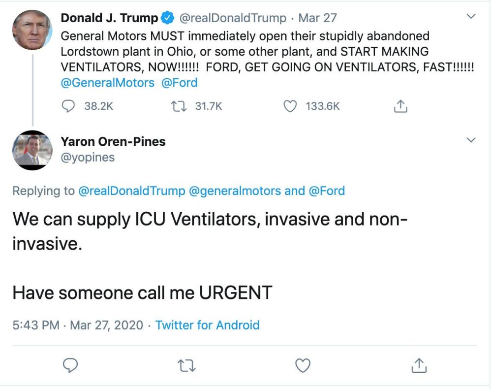 据纽约时报5月8日报道,3月27日美国总统特朗普一条督促通用等公司加紧制造呼吸机的推特下,50岁的硅谷工程师奥伦留言,表示自己可以提供大量有创和无创的呼吸机。