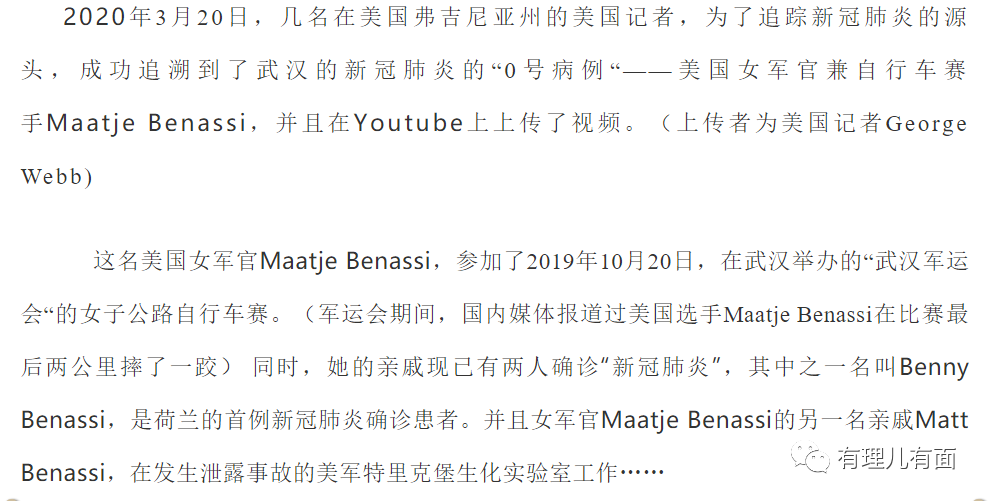 在美国弗吉尼亚州,调查记者George Webb自称追溯到了疑似武汉“零号病例”的女军官MaatjeBenassi,她和荷兰的零号病人Benny Benassi有着相同的姓氏。该团队认为这名女军官与位于德特里克堡的美国陆军最高机密传染病医学研究所有着密切关联,断言Maatje Benassi是感染后参加的2019年10月 “武汉军运会”,旨在执行一项“特殊任务”,并称“武汉军运会”是最好的病毒投放场所。