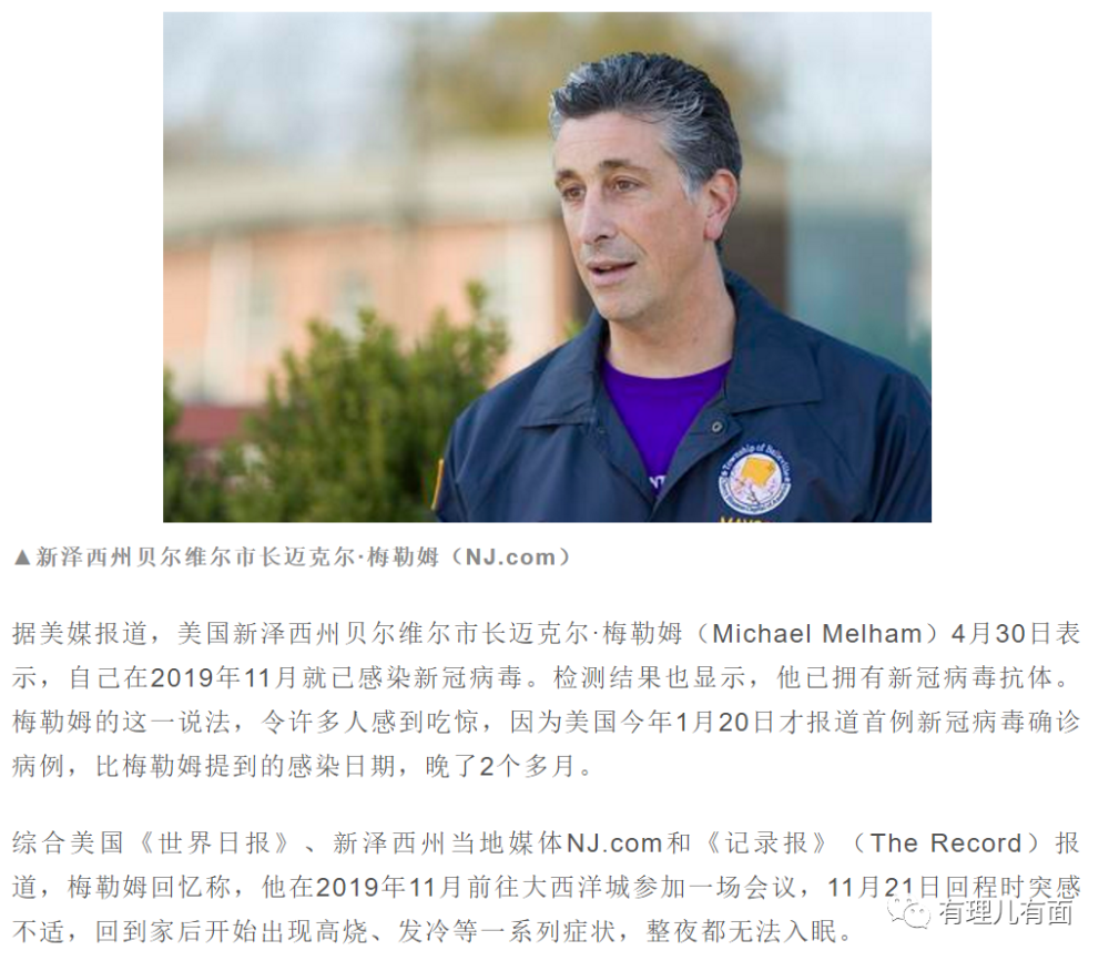 新闻报道4:美国新泽西州贝尔维尔市长迈克尔・梅勒姆(Michael Melham)4月30日表示,自己在2019年11月就已感染新冠病毒。