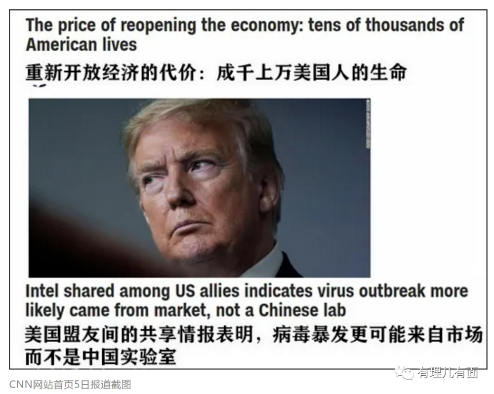 美媒CNN5月5日也给出了病毒并非来自中国实验室的结论:“五眼联盟”之间的共享情报显示,新冠病毒并不是来自于中国的实验室,这与特朗普及美国国务卿蓬佩奥的说辞相悖。