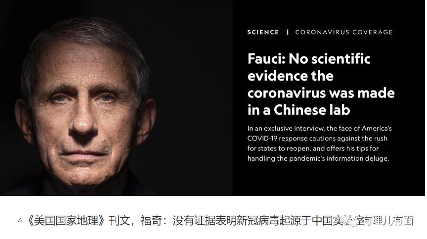 5月4日,美国“抗疫队长”安东尼・福奇也“打脸”蓬佩奥称,没有科学证据显示病毒来自中国实验室。