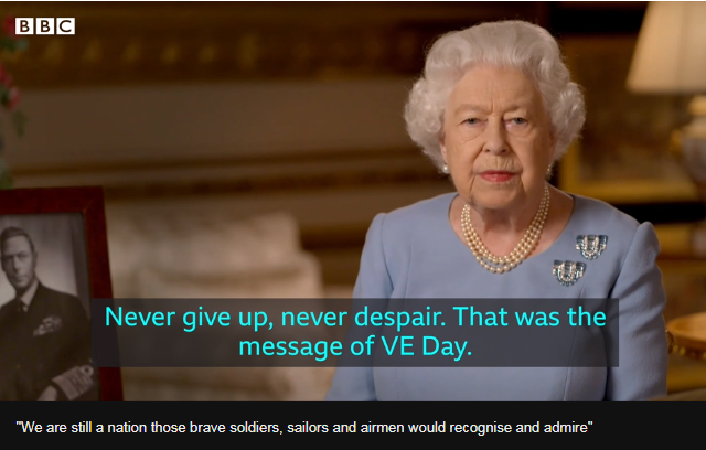 绝不放弃,永不绝望(Never give up, never despair)。今天(5月8日),英国举行活动纪念第二次世界大战欧洲战场胜利75周年,悼念在战争中牺牲的战士和罹难民众。94岁高龄的女王再次通过电视讲话,鼓励在家熬了将近50天的英国人民,要坚持下去,直到胜利。