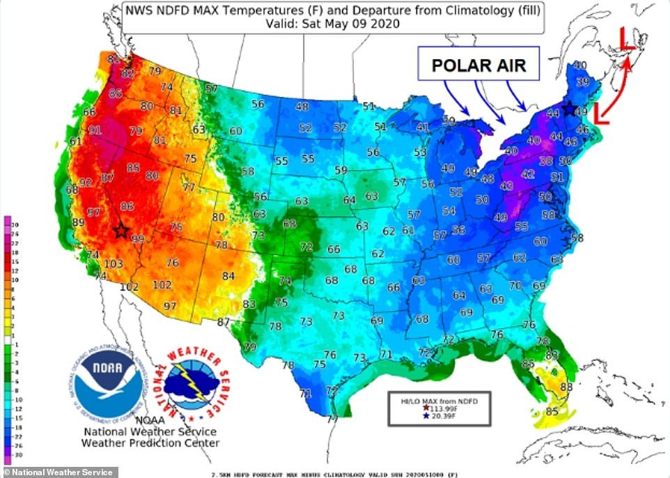 这是9日当天美国的气温图,真可谓是冰火两重天,东海岸几乎都是蓝紫色,而西海岸却是红橙色,不过据报道称,图片上没有显示出当天的最大温差,当日加利福尼亚州死亡谷(Death Valley)的最高气温为110H(约43.3℃),而新罕布什尔州华盛顿的最高气温则只有10H(-12.2℃),相差了100H(约37.8℃),而到了母亲节,也就是10日,温差还有进一步拉大的趋势。