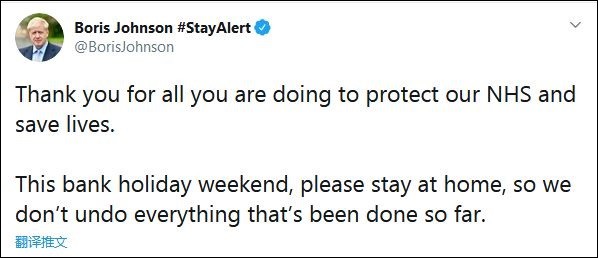 颇令人感到讽刺的是,同一天约翰逊还在推特上向民众呼吁,在银行假期(英国公共假期之一,今年的时间为5月9日和10日,观察者网注)期间,请待在家中,这样“我们就不会破坏到目前为止所做的一切”。