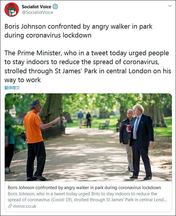 约翰逊的这一举动,在社交媒体上,收获了不少嘲笑和反对。一名网友敏锐地发现了其中反差:约翰逊在上班路上漫步于圣詹姆斯公园。今天,他还在推特上敦促人们待在室内,减少病毒传播。
