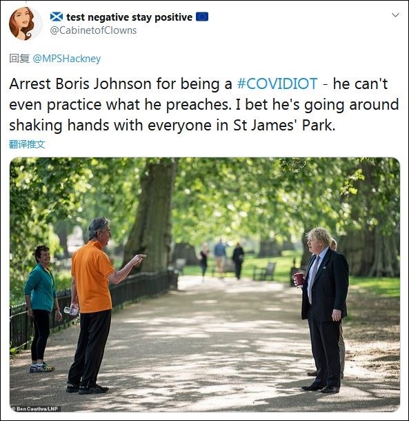 还有网友嘲笑称:“请逮捕约翰逊,因为他是个‘新冠白痴’,他甚至无法做到自己宣扬的那些(防疫措施)。我打赌,他会和圣詹姆斯公园内的每一个人握手。”