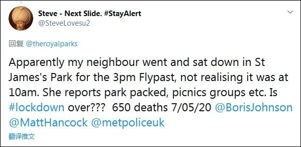 还有人提到了圣詹姆斯公园内的情况:“我邻居说公园内挤满了人,还有野餐人群,疫情封锁结束了吗?5月7日那天还有650人因新冠肺炎死亡。”