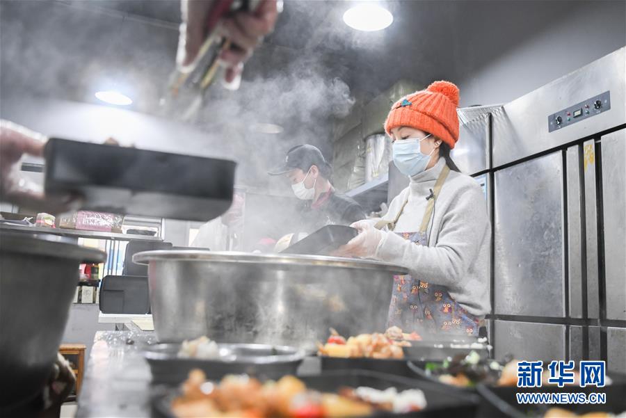 2月26日,爱心人士雨衣妹妹(右)在分装盒饭。 新华社记者 程敏 摄