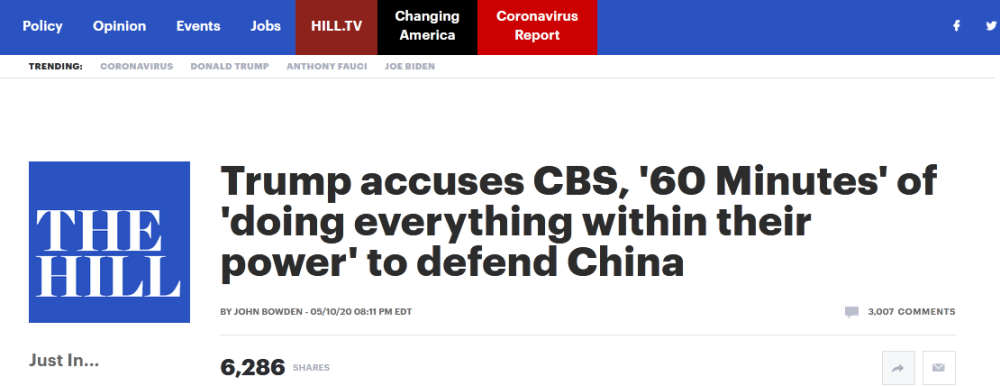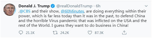 “即使他们现在的能力大不如从前了,CBS和他们的节目《60分钟》还是正尽其所能地维护中国,为在美国和世界其他地区肆虐的可怕的病毒大流行找说辞。我猜他们想在中国做生意!”特朗普写道。