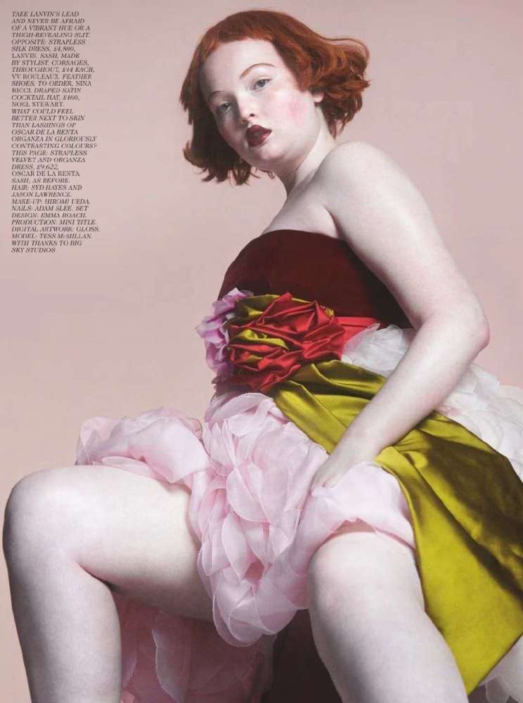 时尚感是与生俱来的,是来自灵魂深处的奇幻体验,而身材并非划定时尚感的绝对标准。英国版《Vogue》九月刊主题摄影“The Age Of Opulence”的主角是一位丹麦爱尔兰混血胖女孩――Tess McMillan。从百货公司员工到平面杂志模特,Tess Mcmillan的成功绝不仅仅是幸运。在整个主题内页,Tess将自我风格发挥的淋漓尽致,一套金属色混搭粉色纱裙,夸张的卷边和不规则裙摆,大胆将裙摆撩到大腿。古典妆容下自信骄傲的眼神,诉说的时代女性的性感与自由。整个画面如油画般精致。
