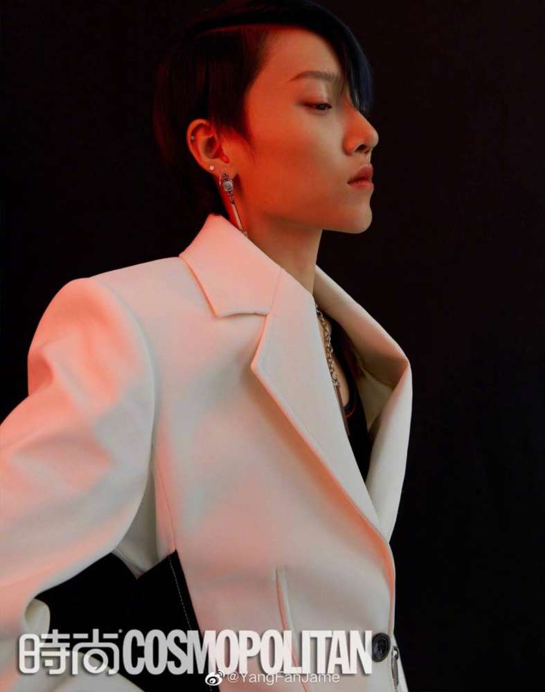 时尚COSMO发布的最新的学员写真,刘雨昕身穿白色西装,剪裁简洁利落,宽松有型,金属长款耳饰造型别致,恰到好处的衬托她修长的脖颈。干净是刘雨昕独特的气质,不管是银色亮片的华丽套装,还是炫酷的皮衣,她都能把控自己灵魂深处的自我――做自己,不怕输。