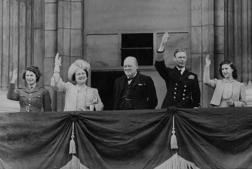 75年前的胜利日,英国王室与首相丘吉尔向民众挥手,左一为时年19岁的伊丽莎白。