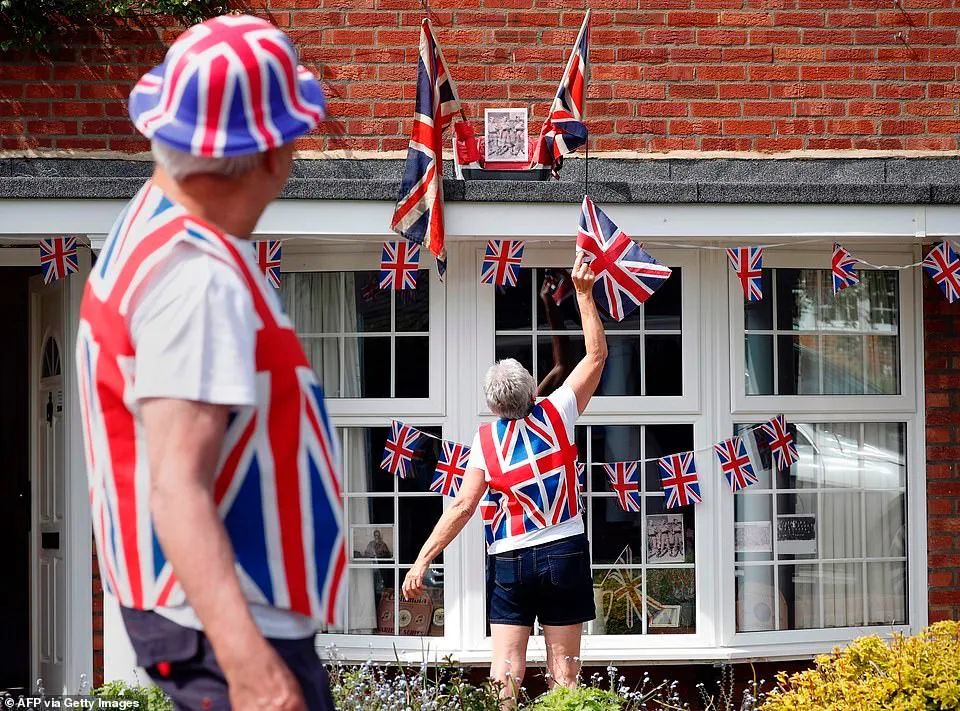 英国民众在房前挂满国旗。