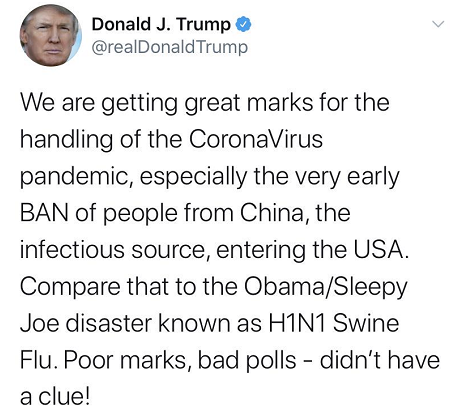 当地时间10日,特朗普在社交媒体上发帖自夸,称在应对新冠病毒上“取得了很好的成绩”。随后,特朗普还将其防疫表现与当初美国应对H1N1疫情进行比较,指出奥巴马应对H1N1不力,“差成绩、糟糕的民调结果――(他们)完全不知道该怎么做”。