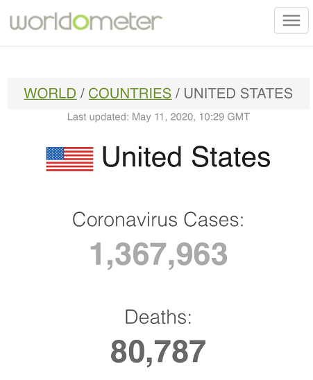 尽管特朗普如此自夸,但据美国约翰斯・霍普金斯大学实时统计数据显示,截至北京时间11日上午11点32分,美国累计新冠肺炎确诊病例升至1329791例,累计死亡病例逼近8万。而“世界实时统计数据(Worldometer)”网站则显示,美国死亡病例已经超过8万。