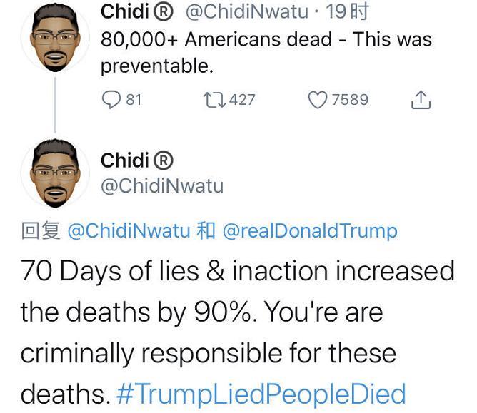 △网友:超80000名美国人去世了,这其实是可以预防的。70天的欺骗和不作为使死亡病例提高了90%,你(特朗普)应该为此负刑事责任。