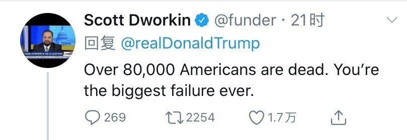 △网友:80000多美国人去世了。你(特朗普)是有史以来最大的失败。