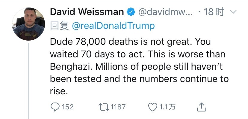 △网友:大哥,有超过78000人死亡可不是个好成绩。你等了70天才作出反应。这比班加西事件还要更糟糕。现在还有百万民众没有进行新冠病毒检测,死亡人数还会上升。