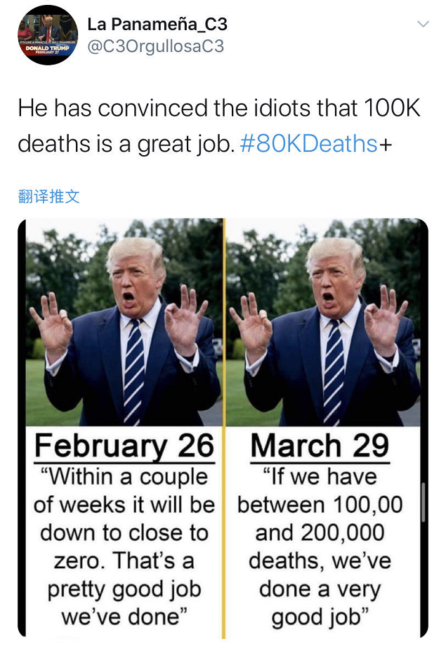 △网友:他说服了一些白痴:100000例死亡病例是个好结果。
