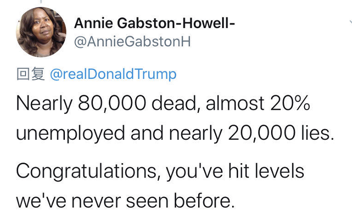 △网友:近80000死亡病例,约20%的失业率和近20000个谎言。祝贺你,你达到的水平确实是此前没有的。