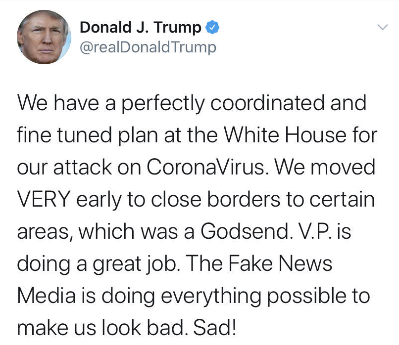 特朗普在社交媒体上宣称,白宫应对新冠病毒“有一个完美的调整计划”,并称赞副总统彭斯领导抗击疫情表现杰出,同时又将矛头对准“假新闻媒体”,批评它们一味抹黑美国政府。