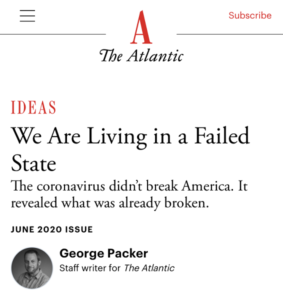 美国《大西洋月刊》则刊登了一篇名为“我们生活在一个失败的国家”的文章,直言新冠肺炎疫情暴露出美国“腐败的政治阶层、僵化的官僚机构、残酷的经济、分裂的民众”等种种深层次问题。