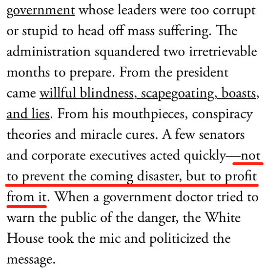 文章指出,美国政府在面对疫情时浪费了两个月的时间,迟迟没有拿出全国统一的计划、没有连贯一致的指令、没有组织各州有效分配物资,家庭、学校和企业被迫各自为战。总统特朗普的态度则是“视而不见、寻找替罪羊、自吹自擂和说谎”,利用疫情为自己的政治利益服务,把国家抛向了一场旷日持久的灾难。