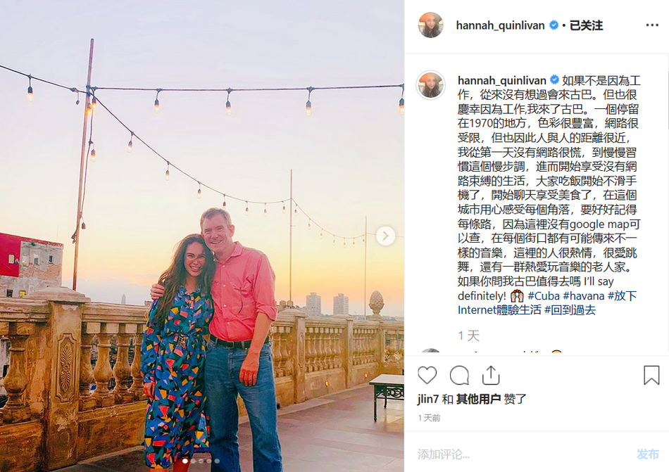 近日,昆凌在个人社交网站晒出与爸爸同游古巴的合照,并发文表示自己从第一天没有网络很慌,到慢慢习惯这个慢步调,进而开始享受没有网络束缚的生活,大家都在这个城市用心感受每个角落。