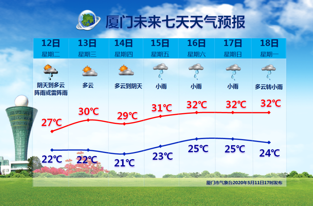 明天起,副热带高压又会上来控制厦门地区,厦门天气晴好,气温逐步回升,白天最高气温将再次突破30℃大关;同时,风力将有所减弱。不过,这次升温过程不会持续太长时间。