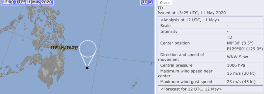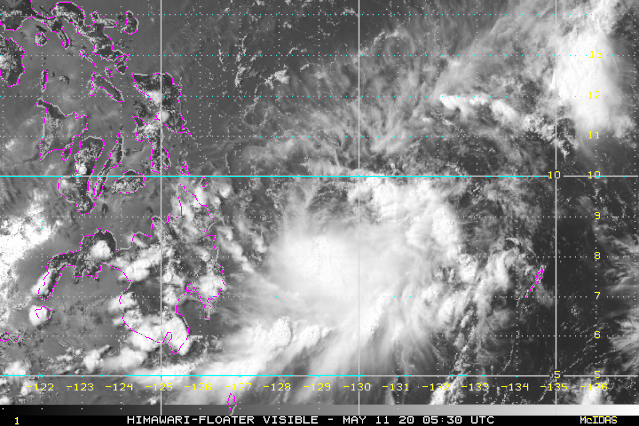 据日本东京台风中心发布的消息,5月11日20时,菲律宾东部热带低压(原热带扰动95W)的中心位于北纬8.5°,东经129.0°,中心附近最大风速15米/秒,中心最低气压1006百帕。