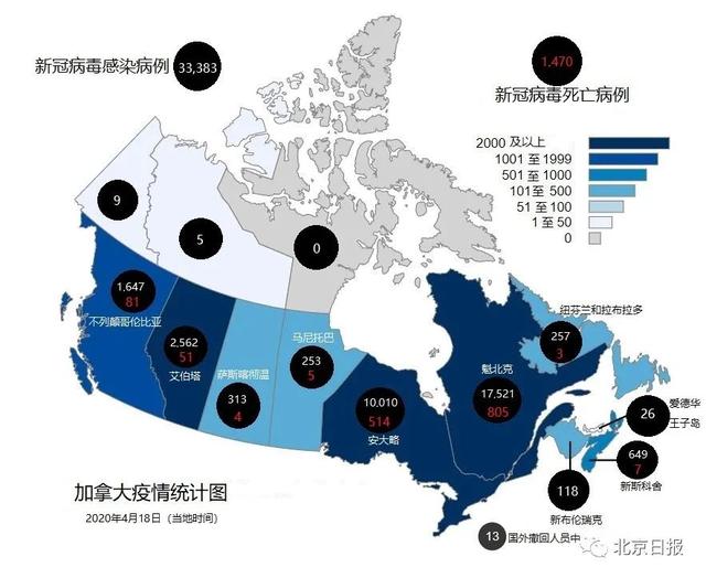 根据加拿大各省当地时间4月18日陆续发布的新冠疫情统计数据显示,截至发稿(当地时间17日17时50分),加拿大累计新冠肺炎确诊病例33383例,累计死亡1470例,比17日分别增加1456例和161例。