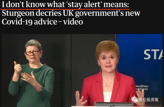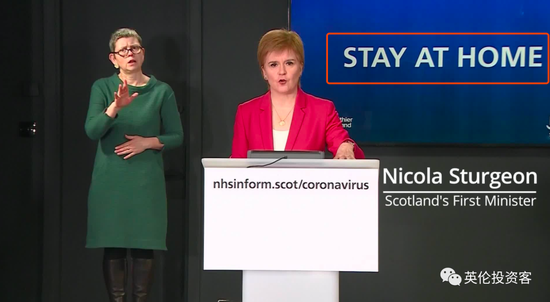 斯特金还特意把“留在家里”的大字打在了背后的公屏上,并表示:“苏格兰会继续使用Stay at Home的口号”。