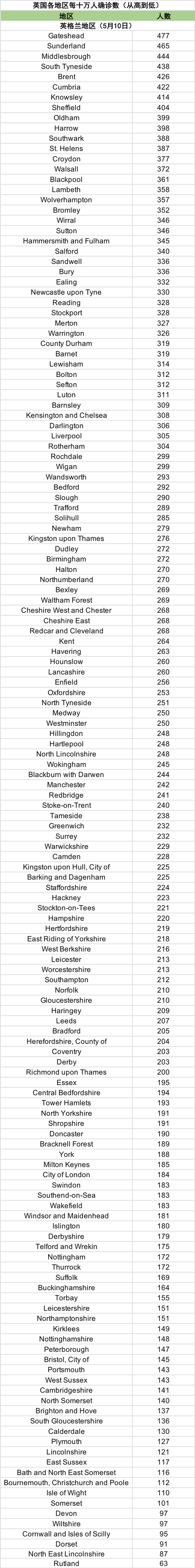 全英各地区每十万人确诊分布(从高到低)