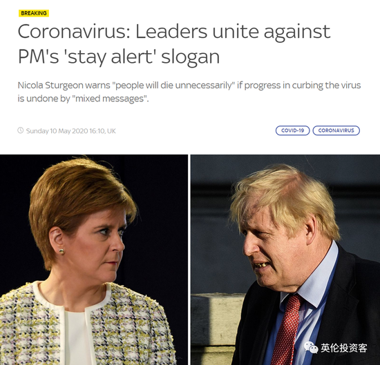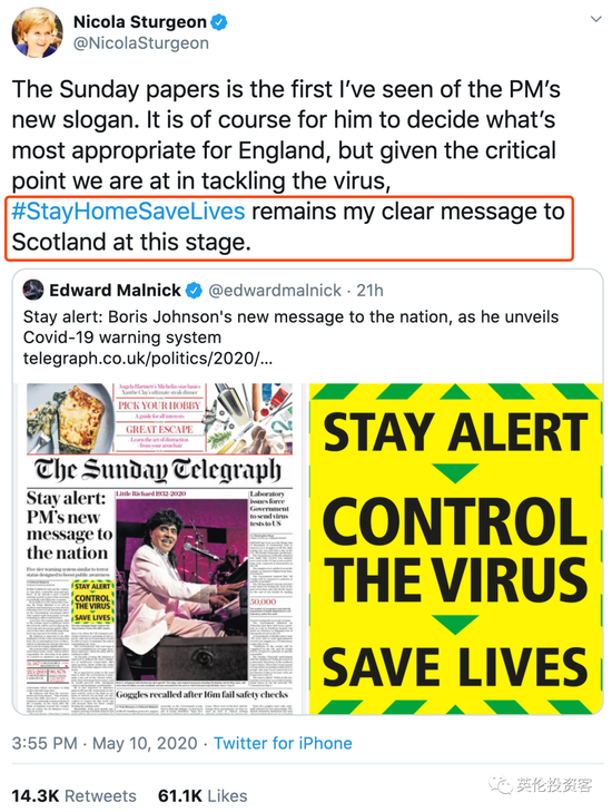 反对新口号,苏格兰、威尔士先后发声在今天的讲话中,鲍里斯特别提到英国不同地区的疫情状况不同,因此各地区可以灵活应对。鲍里斯表示,英格兰、苏格兰、威尔士和北爱尔兰将会共同击败新冠病毒。首相这一言论和上述地区领袖近期频频发声有关。今天,苏格兰首席部长率先对鲍里斯呛声,一大早就发推称,她从周日报纸上才知道鲍里斯要发布新口号了,暗示自己并不提前知道英国政府要改口号的消息。她还表示,“鲍里斯当然可以决定什么对英格兰最合适,但根据抗疫现状,留在家里拯救生命仍然是我传达给苏格兰的口号。”很显然,苏格兰不想改口号。