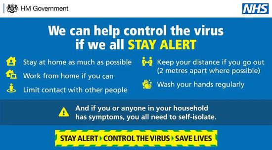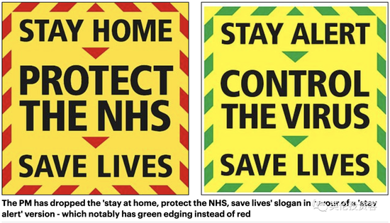 改成了Stay Alert(保持警惕)—Controlthe Virus(控制病毒)—Save Lives(拯救生命)