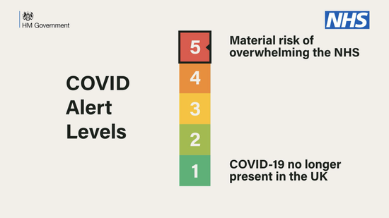 Level One means the disease is no longer present in the UK and Level Five is the most critical – the kind of situation we could have had if the NHS had been overwhelmed。