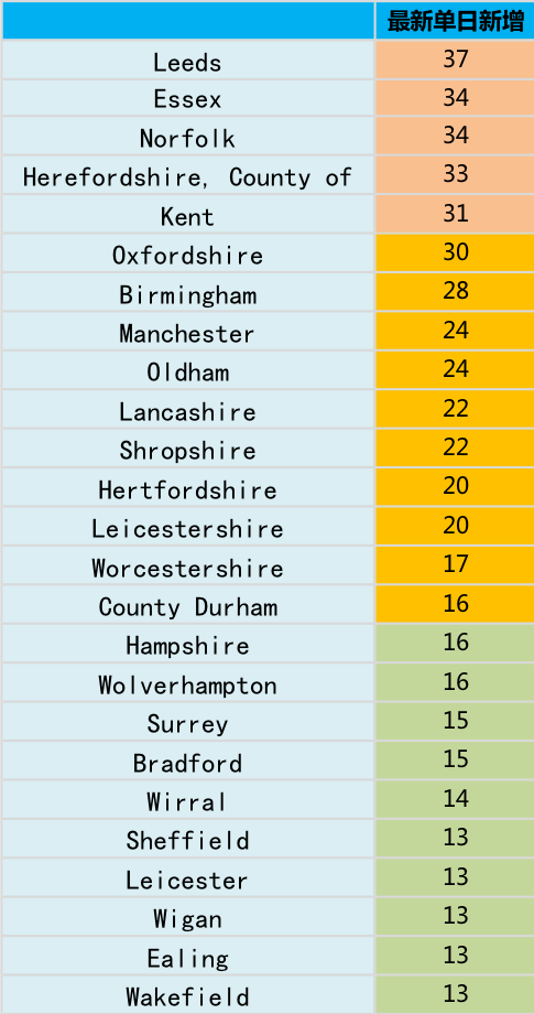 过去24小时,英格兰地区单日新增确诊排名前三:Leeds (+37);Essex(+34);Norfolk(+34);