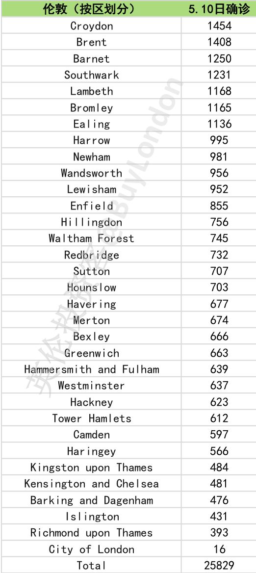 伦敦累计25829例,具体分布如下: