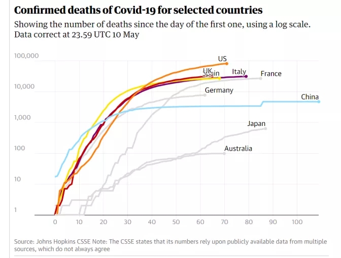 在这张图中英国的病亡数曲线,是上图中大红色那一根。