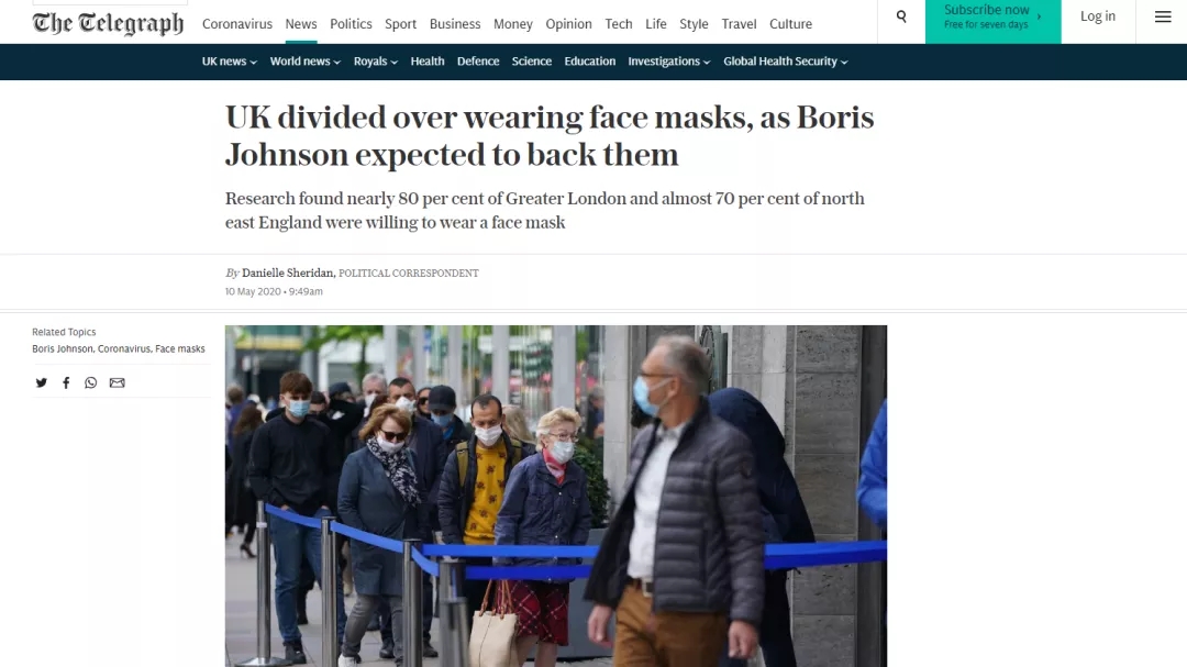 “然而,像南安普顿和沃灵顿这样的地方,刚刚超过一半的人口愿意戴口罩。此前,英国皇家学会的14名科学家表示,科学证据标明口罩是对抗新型冠状病毒的重要工具。”